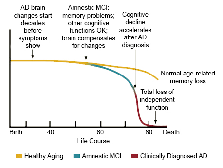 Figure 4: Charting the Course from Healthy Aging to AD. MCI: mild cognitive impairment; AD: Alzheimer’s disease. Source: National Institute On Aging – NIH